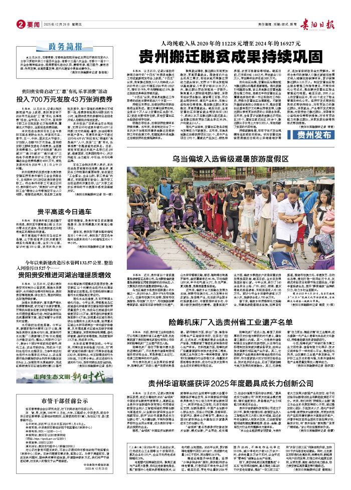 本报讯 12月25日,记者从贵阳高新区获悉,在近日揭晓的2025“金领奖”中国经济创新奖年度榜单上,高新区企业贵州华谊联盛科技有限公司凭借在数据安全和人工智能领域的持续创新与高速成长,从全国