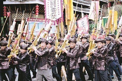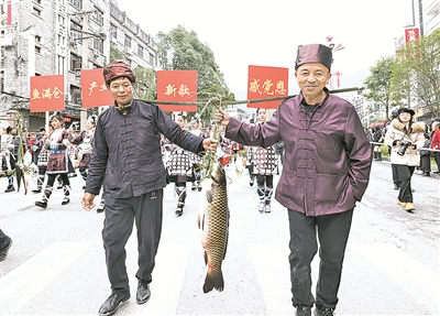 侗族群众抬着一条大鱼巡游,庆祝丰收,寓意“年年有余”。