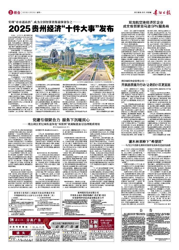 本报讯 12月27日,贵州省现代城乡经济发展研究院对外发布2025年度贵州经济“十件大事”。这十件大事涵盖发展主题、产业体系、重大项目、交通突破、科技创新等多个关键领域,全面展现贵州在中国式
