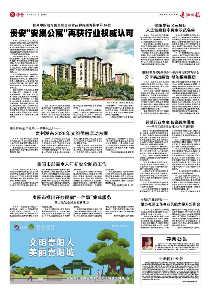 本报讯 2025年12月31日,《2025Q4中国住房租赁地方国企品牌传播力榜》发布,贵安新区人才安居品牌“安巢公寓”排名跨越式提升,位列中国地方国企住房租赁品牌传播力榜单第20位,再次印证