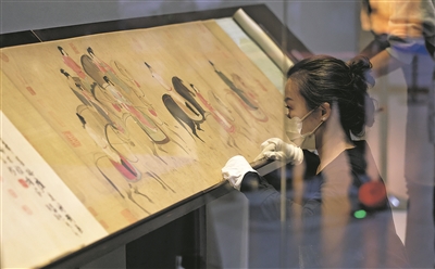 宋摹张萱《虢国夫人游春图》目前在辽宁省博物馆“诗画中国——中国绘画的诗意之境”大型展览中展出,展至3月29日。该画作是唐代仕女画代表之一。图为工作人员在检查《虢国夫人游春图》。