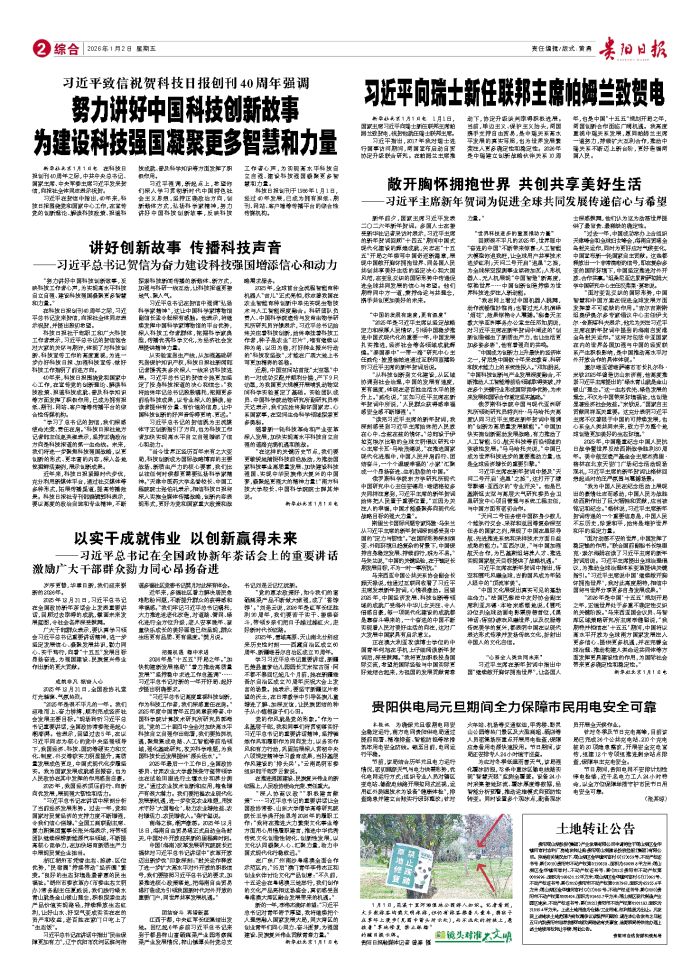 新华社北京1月1日电 在科技日报创刊40周年之际,中共中央总书记、国家主席、中央军委主席习近平发来贺信,向报社全体同志表示祝贺。 习近平在贺信中指出,40年来,科技日报围绕党和国家中心