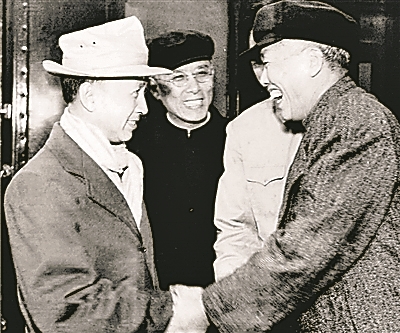 钱学森(左一)抵达北京时,与前来迎接的中国科学院时任副院长吴有训(右一)亲切握手。