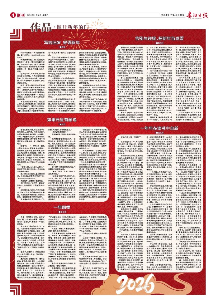 ■周斐 2025年的最后一页日历悄然飘落。窗外的天光一点点亮起来,2026年来了。 时光如锦缎般从我们的指缝间悄然滑过,带走一整年的喧嚣与寂静。站在岁序交替的门槛上,身后是一整年的