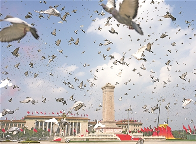 ◀2025年9月3日,纪念中国人民抗日战争暨世界反法西斯战争胜利80周年大会在北京隆重举行。这是纪念大会现场放飞鸽子。