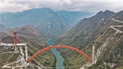 1月5日,随着最后一节钢拱精准吊装到位,贵州交投集团承建的安顺至盘州高速公路古牛河特大桥顺利合龙,为后续工程建设推进奠定了坚实基础。古牛河特大桥是安盘高速控制性工程,全长881.8米,主桥横跨古牛河,主桥桥面到谷底高度约400米。