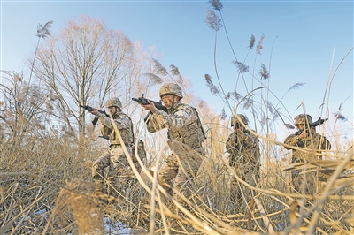 图为1月4日,武警山西总队忻州支队官兵开展山林地捕歼战斗演练。 新华/传真