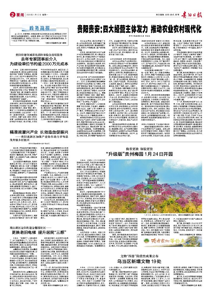 本报讯 记者从1月10日举行的探园活动中获悉,升级后的贵州梅园将于1月24日开园,以更广阔的花海、更完善的设施、更丰富的业态,邀八方游客共赴一场充满浪漫诗意的梅花之约。 当天,100余