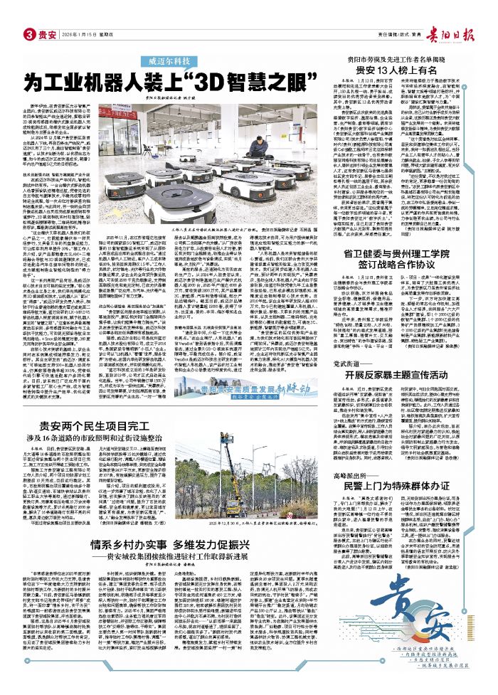 贵阳日报融媒体记者 姚方媛 新年伊始,在贵安新区光谷智算产业园内,贵安新区威迈尔科技有限公司的四条智能生产线全速运转,搭载自研3D视觉传感器的潜伏式搬运机器人完成性能测试后,陆续发往全国