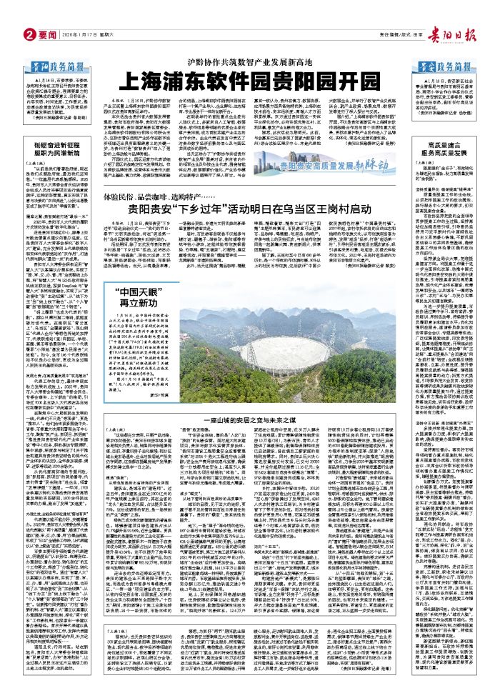 本报讯 1月18日,贵阳贵安“下乡过年”活动启动仪式——“我们的节日・春节”文明实践活动,将在“庖汤第一村”乌当区新堡布依族乡王岗村举办。 活动期间,除了正式发布贵阳贵安乡村旅居“下乡