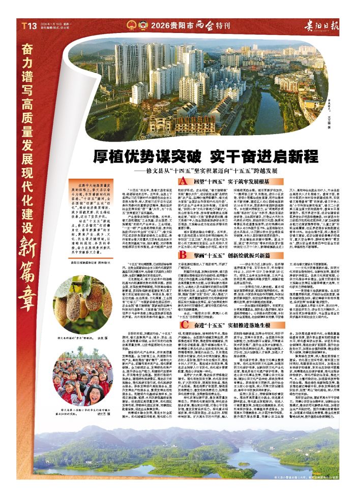 在黔中大地高质量发展的征程上,修文县以奋斗为笔,书写着新时代的答卷。“十四五”期间,全县围绕“四新”主攻“四化”,推动经济提质增效、城乡面貌更新、民生福祉改善,迈出了坚实步伐。 站在“十