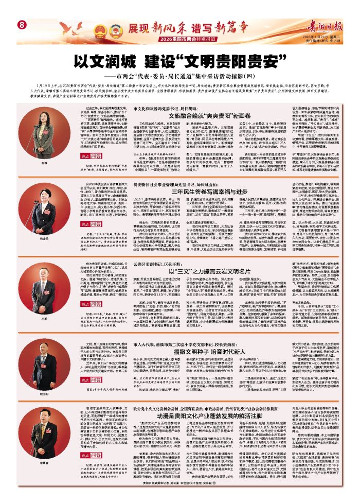 1月19日上午,在2026贵阳市两会“代表·委员·局长通道”第二场集中采访活动上,市文化和旅游局党委书记、局长胡琳;贵安新区社会事业管理局党组书记、局长姚金仙;云岩区委副书记、区长王黔;市人大