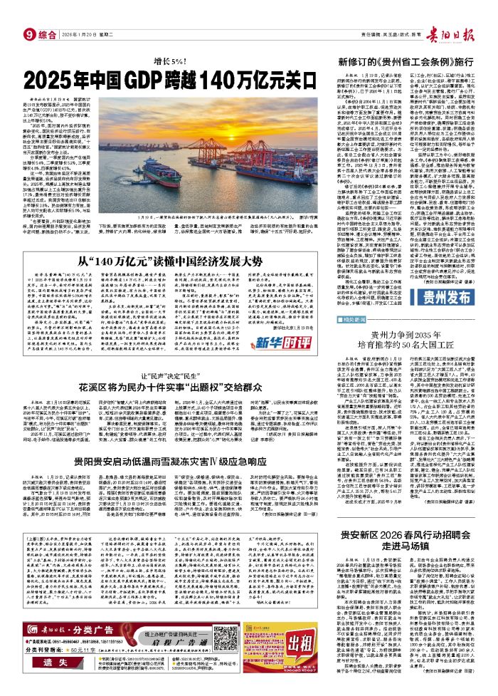 本报讯 1月19日,记者从省政府新闻办举行的新闻发布会上获悉,新修订的《贵州省工会条例》(以下简称《条例》),已于2026年1月1日起正式施行。 《条例》自2004年11月1日实施以来
