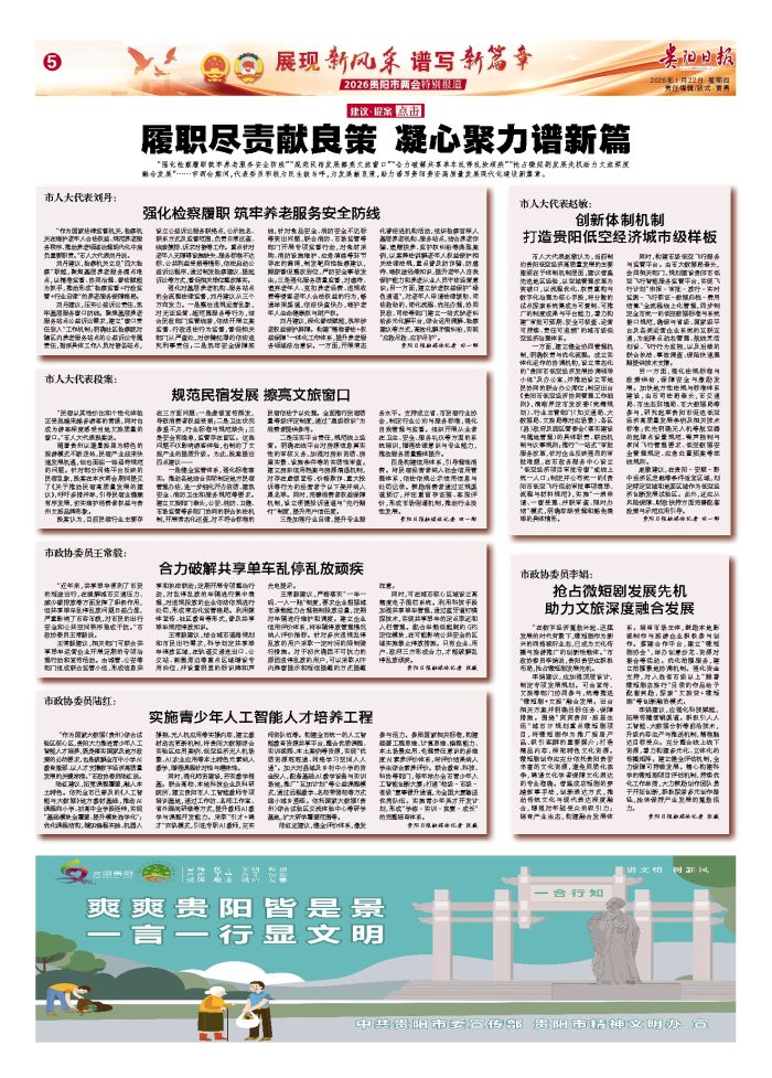 “强化检察履职筑牢养老服务安全防线”“规范民宿发展擦亮文旅窗口”“合力破解共享单车乱停乱放顽疾”“抢占微短剧发展先机助力文旅深度融合发展”……市两会期间,代表委员积极为民生鼓与呼,为发展献良策
