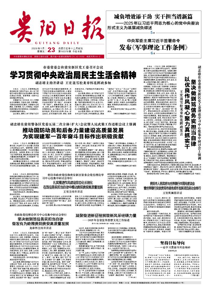 市两会总结“十四五”发展成就,明确“十五五”奋斗目标,部署2026年重点工作,动员贵阳贵安广大干部群众勠力同心、开拓进取,真抓实干、善作善成,为谱写高质量发展、现代化建设新篇章而努力奋斗。我们