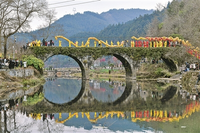 人们在锦屏县隆里古城举办的“村晚”巡游活动中舞龙(2025年2月11日摄)。