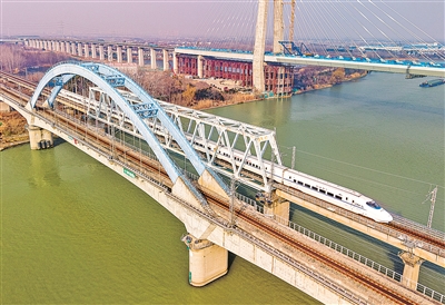 图为1月25日,列车行驶在宁启铁路扬州段(无人机照片)。 新华/传真