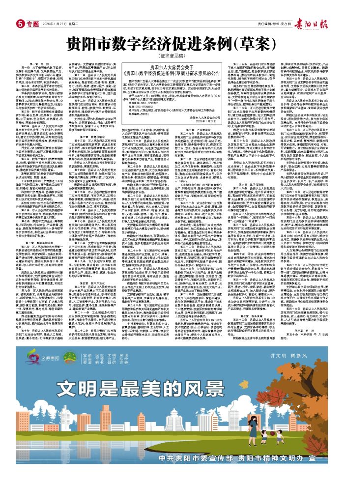 贵阳市人大常委会关于 《贵阳市数字经济促进条例(草案)》征求意见的公告 贵阳市第十五届人大常委会第三十一次会议对《贵阳市数字经济促进条例(草案)》进行了初次审议,市人大常委会法工委