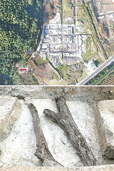 上图为浙江施岙遗址出土良渚文化时期杨梅古树遗存的探沟位置(标红);下图为施岙遗址杨梅古树遗存出土现场。