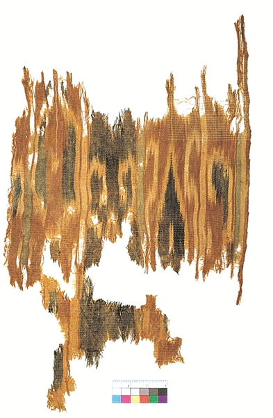青海都兰热水墓群2018血渭一号墓出土的扎经染色织物实物图。