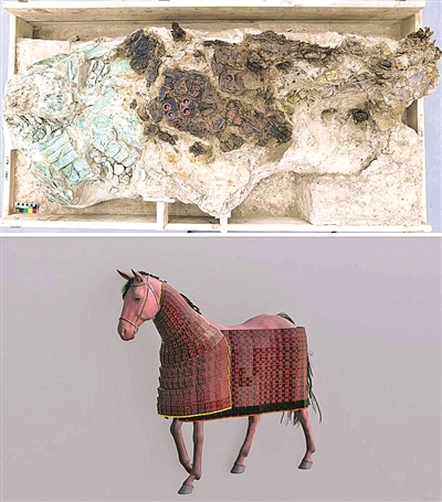 上图为由青海都兰热水墓群2018血渭一号墓经套箱提取修复前的唐代髹漆马铠甲;下图为经研究后运用数字技术复原的唐代髹漆马铠甲示意图。
