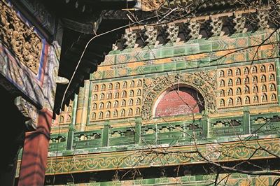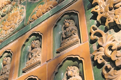 三覆檐歇山琉璃阁外立面上的无量寿佛琉璃像。 新华/传真