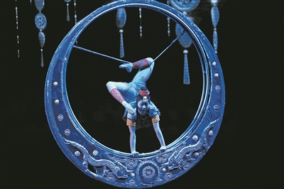 谷安然以具体例子作说明。在剧目创作初期,原本并未设置空中吊环的表达。但在深入研究贵州本地民族文化的过程中,苗族银项圈启发了主创人员。“银项圈所承载的仪式感、重量感与环形结构,与剧情中人物所处的情境高度契合。我们将这一文化意象进行尺度与功能上的转化,把银项圈放大为舞台上的空中吊环,使杂技技巧本身成为文化意象的延伸,既服务了剧情发展,也让地域文化自然融入表演语言之中。”谷安然说。在苗族蜡染元素的处理上,没有选择对工艺流程的直接再现,而是提炼其“制作行为”中的身体逻辑与空间特征,将搅缸染布的循环与摆动关系,转化为杂技技术中“摇摆杆”的动态结构。同理,将苗绣绣布过程中的节奏与专注、蜡染晾布时布料的延展与悬垂感,分别与“抖空竹”“绸吊”杂技技术相融合。“通过这样的拆解、转译与融合,民族非遗不再是视觉符号,而是由杂技动作构成的叙事段落,参与到剧情与情绪的推进之中。”谷安然说。