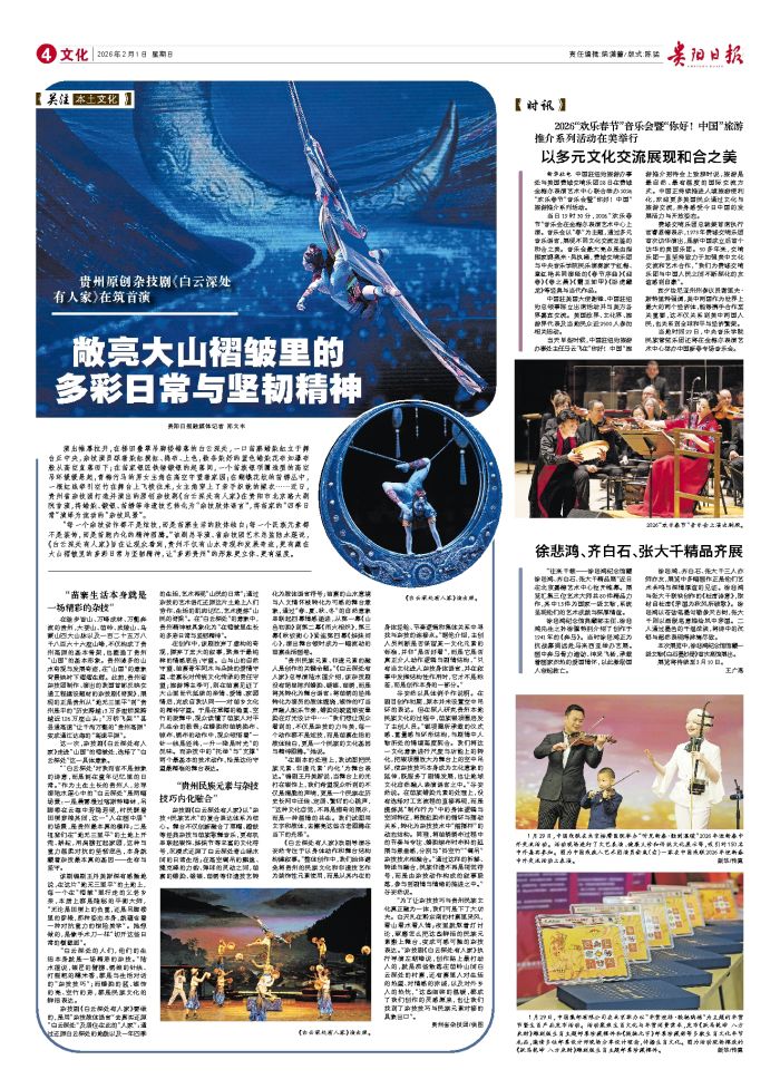 “每一个杂技动作都不是炫技,而是苗寨生活的肢体独白;每一个民族元素都不是装饰,而是苗胞内化的精神图腾。”该剧总导演、省杂技团艺术总监陆水莲说,《白云深处有人家》旨在让观众看到,贵州不仅有山水奇观和发展奇迹,更有藏在大山褶皱里的多彩日常与坚韧精神,让“多彩贵州”的形象更立体、更有温度。