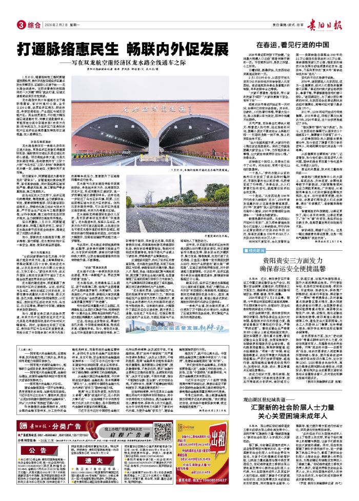 本报讯 近日,贵阳贵安召开春运工作暨交通运输安全生产会议,部署从安全保障、运输组织、优质服务三方面发力,确保春运期间交通运输领域安全、便捷、畅通、有序、温馨。 2026年春运于2月2日