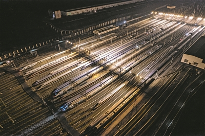 图为动车所外的存车场上,“和谐号”“复兴号”等一列列动车组整齐列队、蓄势待发,宛如蛰伏的“钢铁巨龙”。