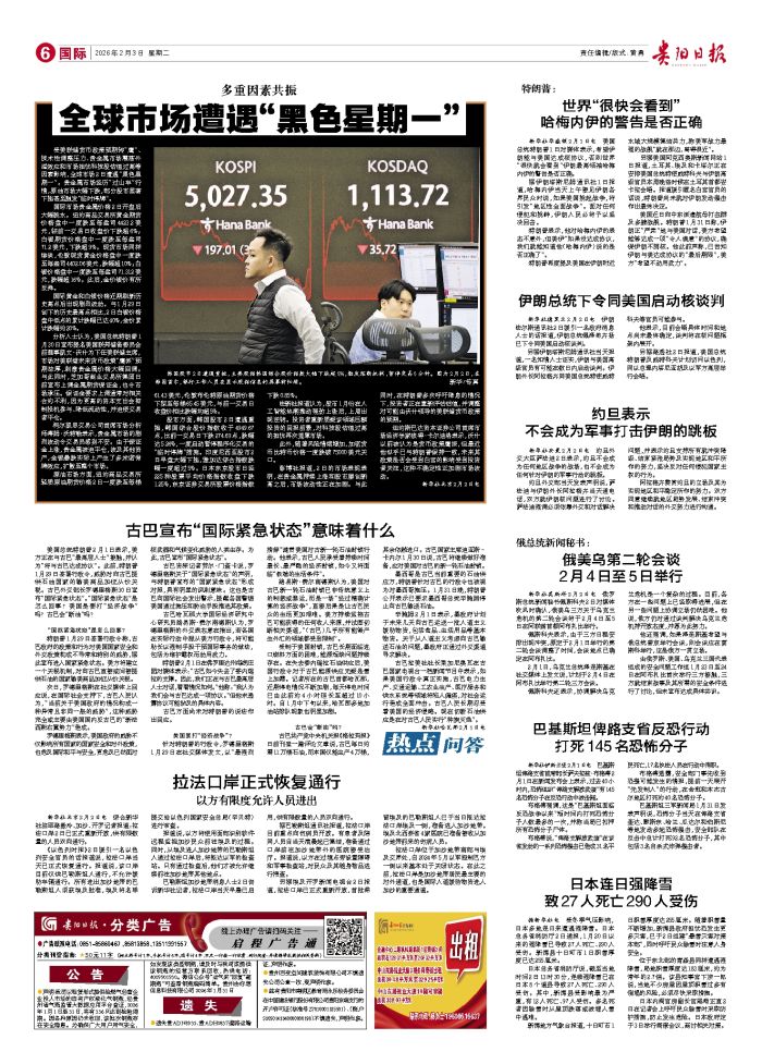 受美联储货币政策预期转“鹰”、技术性调整压力、贵金属市场震荡外溢效应和市场担忧科技股估值过高等因素影响,全球市场2日遭遇“黑色星期一”。贵金属市场经历“过山车”行情,原油市场大幅下跌,部分股市