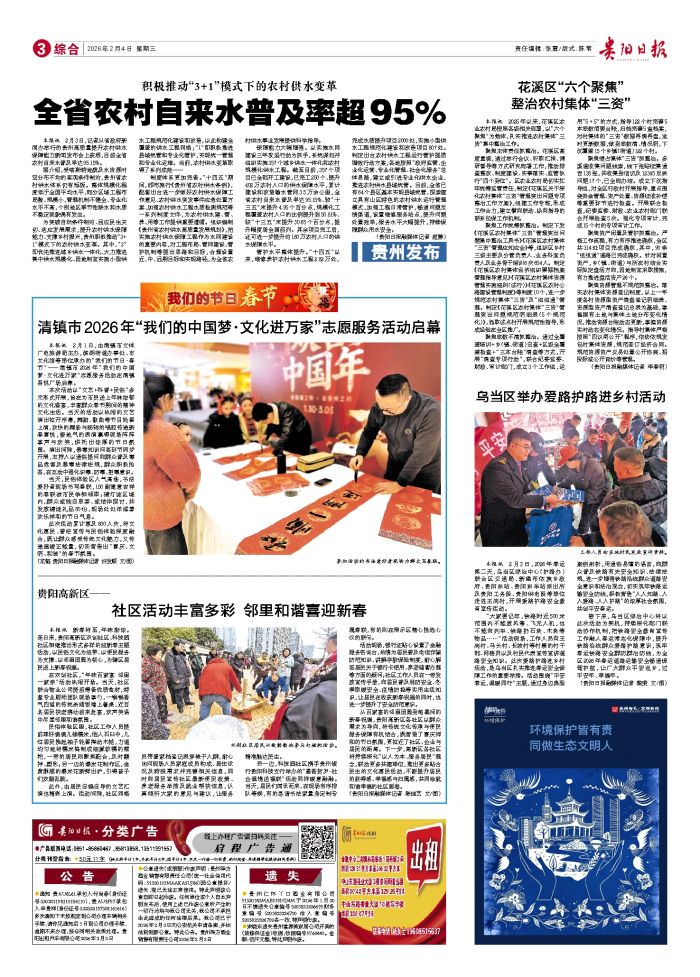 本报讯 2月3日,记者从省政府新闻办举行的贵州高质量提升农村供水保障能力新闻发布会上获悉,目前全省农村自来水普及率达95.15%。 据介绍,受喀斯特地貌及水资源时空分布不均的客观条件制