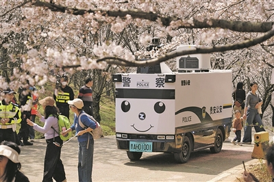 2025年春季,贵安新区公安局“智警小安”在贵安樱花园内守护平安。