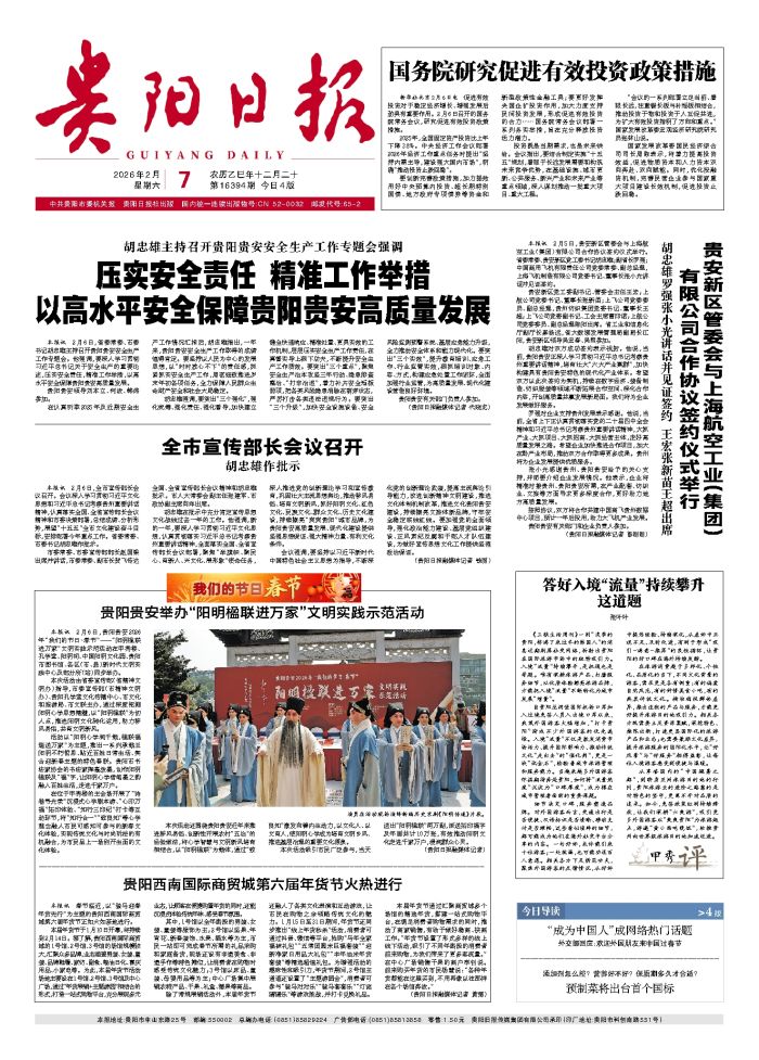 本报讯 2月6日,省委常委、市委书记胡忠雄主持召开贵阳贵安安全生产工作专题会。他强调,要深入学习贯彻习近平总书记关于安全生产的重要论述,压实安全责任,精准工作举措,以高水平安全保障贵阳贵安高质量发展。
