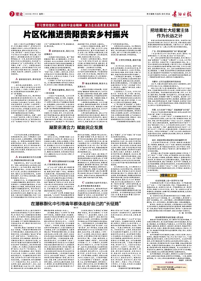 张林俊 党的二十届四中全会明确提出“分类有序、片区化推进乡村振兴”,贵阳贵安片区化推进乡村振兴,必须立足市情农情,充分发挥既有基础,精准识别优势与约束。一方面,贵阳贵安“一核两区多板块”