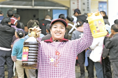 枫林村2025年度分红大会现场,村民展示领到的物资。 贵阳日报融媒体记者 石照昌 摄