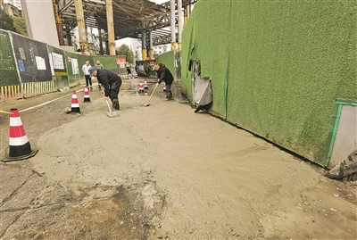工作组协调太慈桥街道办事处、南明区市政工程服务中心、南明区城市更新事务中心以及太金线高架桥施工方来到现场协商解决办法。为保障市民出行安全,几家单位现场协商后给出了处置方案——由太金线高架桥施工方用混凝土对路面坑洼进行修复,解决路面积水问题。