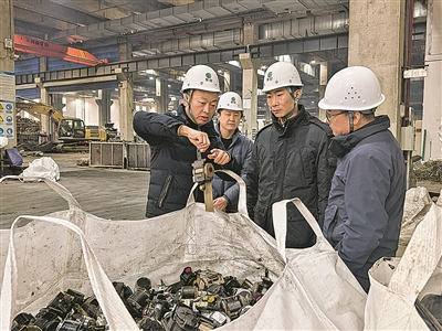 乌当区人大代表陈凯(左一)在工厂指导废旧电池拆解工作。