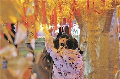 天色渐暗,灯会庙市的游客更多了,有在祈祷墙前打卡的,有在彩灯前留影的,还有在美食摊位前驻足品小吃的,人气更加高涨。