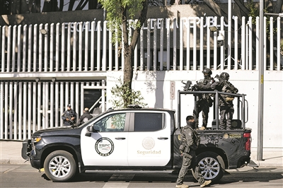 墨西哥安全部长奥马尔·加西亚·阿富奇23日说,“哈利斯科州新生代”头目在军方抓捕行动中身亡后,该贩毒集团在多地发动报复袭击,造成27名安全人员死亡。墨西哥总统辛鲍姆23日早些时候表示,为应对骚乱而设置的路障当天已经基本撤除,国内局势趋向平静。图为2月23日,在墨西哥首都墨西哥城,安全人员在街头执勤。 新华/传真