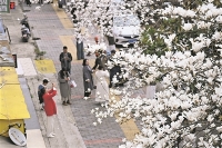 2月24日下午,白云区朝晖路显现出一派春日景象——道路两侧的玉兰花进入盛放期,白色花朵缀满枝头,吸引众多市民、游客及摄影爱好者前往观赏、拍摄。 图为市民游客在朝晖路拍摄玉兰花。 贵