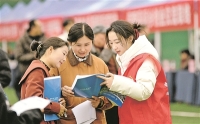 近日,全国各地举行形式多样的招聘活动,助力就业。 图为2月25日,在湖北省襄阳市保康县“春风行动”大型招聘会现场,工作人员(右)向求职者介绍用工信息。 新华/传真