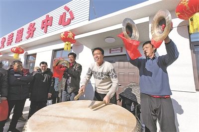 2025年1月28日,辽宁省葫芦岛市绥中县明水满族乡祝家沟村村民在重建新房的村党群服务中心前鸣锣击鼓。