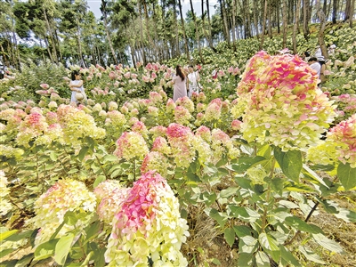 除了梅花,目前贵州梅园正推进绣球花、紫薇花、彩叶林等主题植物园建设,全力打造“四季有花、四季有景”的景观效果。2025年夏季,贵州梅园首次推出的600余亩绣球花海惊艳亮相,近60个品种的绣球花形成立体花境,成为夏季热门赏花目的地,深受贵阳贵安避暑旅居游客青睐,3个月的花期内游客接待量达16万人次。