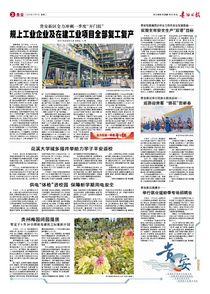 作为全国唯一肩负生态文明示范区建设使命的国家级新区,贵安新区生态景观资源丰富。其中,被誉为“蓝色星球上最美的樱花园”的贵安樱花园万亩樱花已含苞待放,预计10天后迎来观赏期,贵阳贵安赏樱季服务保障工作正紧张筹备中。贵州梅园也将全力筹备夏季绣球花海景观,实现从“梅香满坡”到“绣球缀岭”的四季景观衔接,不断丰富“爽爽贵阳·山水贵安·花漾高峰”品牌内涵和赏花体验场景,推动贵安新区赏花经济从“一季惊艳”向“四季有景”跨越升级。