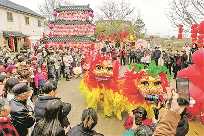 元宵节将至,各地举办丰富多彩的活动,喜迎佳节。图为2月28日,游客在浙江省湖州市长兴县画溪街道观看“踩街”表演。 新华/传真