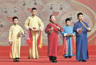 2月28日,2026年全国“我们的节日·元宵”主题文化活动山东示范活动在青岛举行。本次活动以“山海共团圆,文化传家久”为主题,设文化惠民、非遗展示、商贸市集等板块,着力营造欢乐吉祥、昂扬奋进的节日氛围。图为小演员在表演花板联唱《夸夸家乡青岛好》。 新华/传真