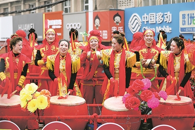 农历正月十二,甘肃省平凉市庄浪县以特有的庄浪高抬社火巡街过大年,现场人山人海,年味浓郁。庄浪高抬是甘肃省庄浪县特有的社火表演形式,为国家级非物质文化遗产项目。图为当地社火队的锣鼓队队员巡街演出。 新华/传真