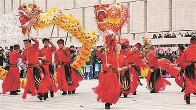 2月28日,中国工艺美术馆(中国非物质文化遗产馆)和中国共产党历史展览馆共同举办“非遗贺新春 民俗闹红火”活动,来自北京、陕西、山西、浙江、内蒙古等8个省区市的民俗展演团队,为观众奉上曾庄大鼓、麒麟舞、寿阳高跷竹马戏、蒙古族马头琴音乐等14项民俗展演。图为来自重庆的中敖火龙在展演中。 新华/传真