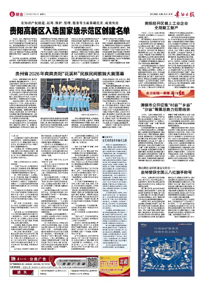 本报讯 锣鼓铿锵传古韵,歌声悠扬颂新春,舞步翩跹展风华。3月3日,正值元宵佳节,贵州省2026年爽爽贵阳“花溪杯”民族民间歌舞大赛在花溪公园音乐广场圆满落幕。本次大赛汇聚地戏组、花灯组、声乐组、舞蹈组四大板块,来自全省的文艺爱好者与民间传承人同台竞技,以多元艺术形式展现非遗魅力、民俗风情与时代风采,为马年元宵佳节献上一场精彩纷呈的文化盛宴。